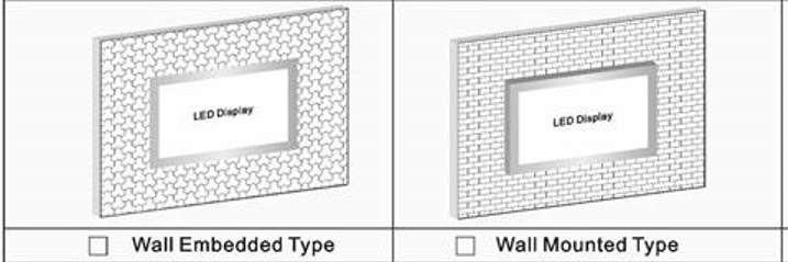 दो एलईडी डिस्प्ले मेंटेनेंस मेथड हैं: फ्रंट मेंटेनेंस / फ्रंट सर्विस्ड / फ्रंट एक्सेस / फ्रंट एंट्रेंस / फ्रंटओपनिंग और रियर मेंटेनेंस / बैक मेंटेनेंस।