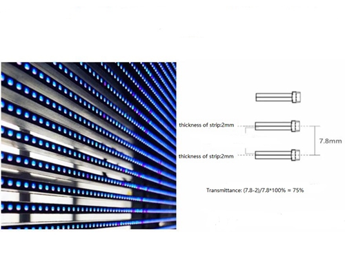 पारदर्शी एलईडी डिस्प्ले की प्रमुख विशेषता पारदर्शिता है। पारदर्शिता का अर्थ है एलईडी डिस्प्ले के माध्यम से प्रकाश संचरण की दक्षता। पारदर्शिता मुख्य रूप से डिस्प्ले के खोखले डिज़ाइन के कारण होती है। सबसे आसान गणना है: पारदर्शिता = (पारदर्शी स्थान/एलईडी स्ट्रिप्स का अंतराल) * 100%।